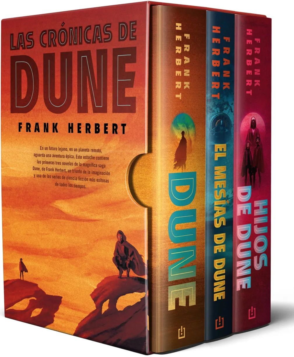 Un estuche de lujo con los tres primeros libros de la epopeya más grande de todos los tiempos en tapa dura con sobrecubiertas. Acabados metalizados, relieves en la cubierta y un diseño con ilustraciones inéditas en España, al alcance de tu mano. En un futuro lejano, en un planeta remoto, se libra una compleja lucha que tendrá repercusiones en toda la galaxia. En las arenas del desértico planeta Akarris, más conocido como Dune, aprender a sobrevivir no es suficiente… Estamos ante una saga apasionante que plantea por primera vez de forma completa, racional y convincente todo un mundo independiente del nuestro. Sin embargo, sus referencias a los problemas ecológicos, el poder de las drogas y la fuerza de los mitos la han convertido en una obra de culto para millones de lectores en todo el mundo. Este estuche contiene las EDICIONES DE LUJO de: 1. Dune, 2. El mesías de Dune, 3. Hijos de Dune.